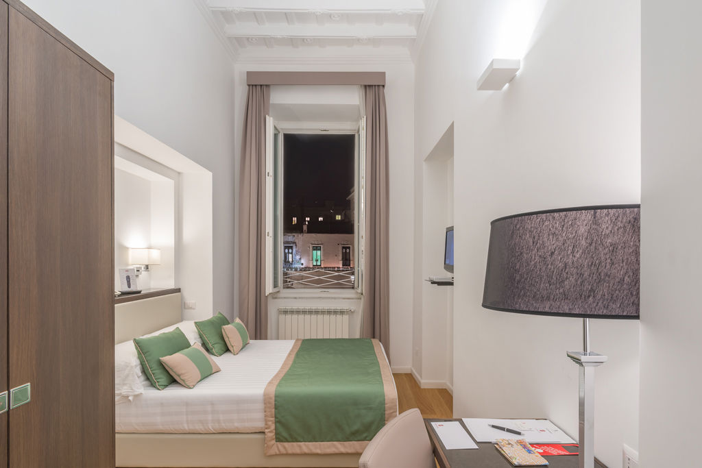 A 22 square meters suite with panoramic view over the Spanish Steps and Trinità dei Monti Church. Accommodating up to 3 people, this room offers a main sleeping area with 1 double bed or 2 single beds and a comfortable sitting area with large sofa that can be used as living room or as sleeping area on a real single mattress for the third guest. This room is equipped with a writing marble table and elegant wooden furniture. The large 6 square meters bathroom with shower, illuminated by a chromatic led light, provides a relaxing and romantic atmosphere.